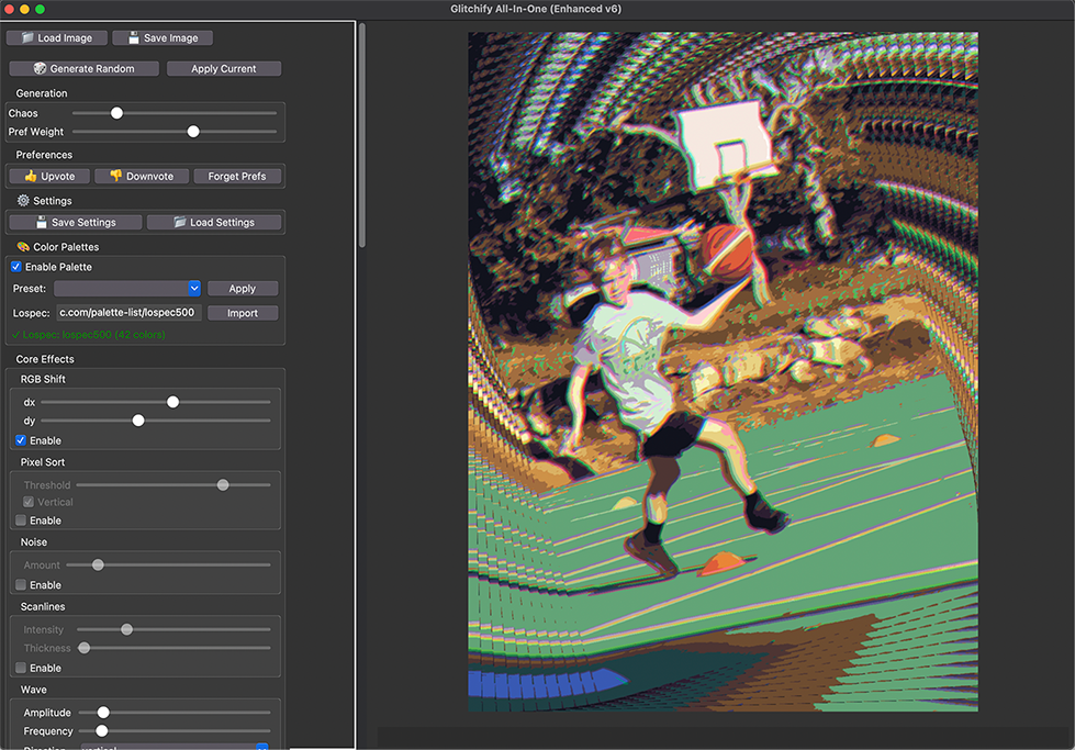 - Preset Palettes: Cyberpunk, Vaporwave, Retro CRT, Gameboy, Hot & Cold, Neon Noir, Pastel Dream